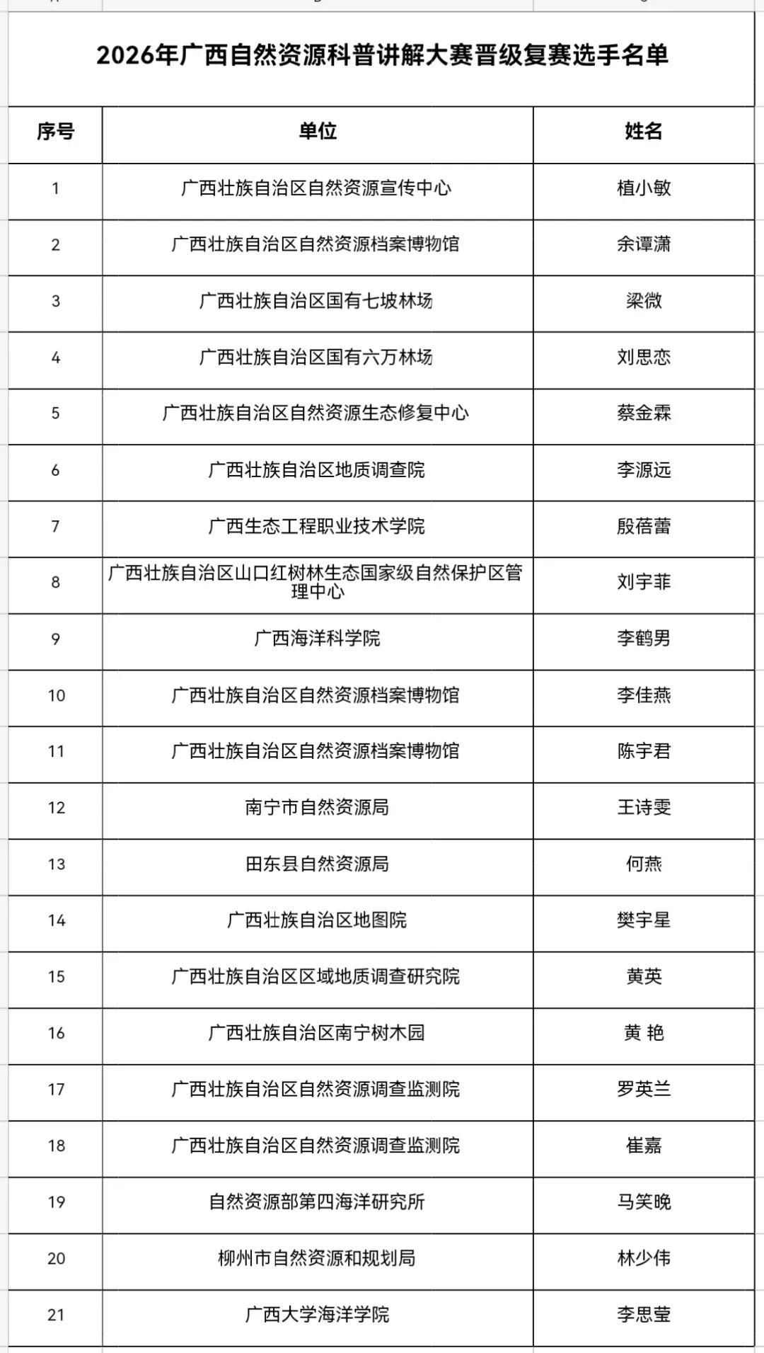 2026年广西自然资源科普讲解大赛初赛评审工作已顺利结束。本届大赛吸引全区自然资源系统机关、事业单位、场馆、高校及企业85名选手报名参赛,经专家评审,最终21名选手(含成绩并列选手)脱颖而出,成功晋级复赛。名单如下: