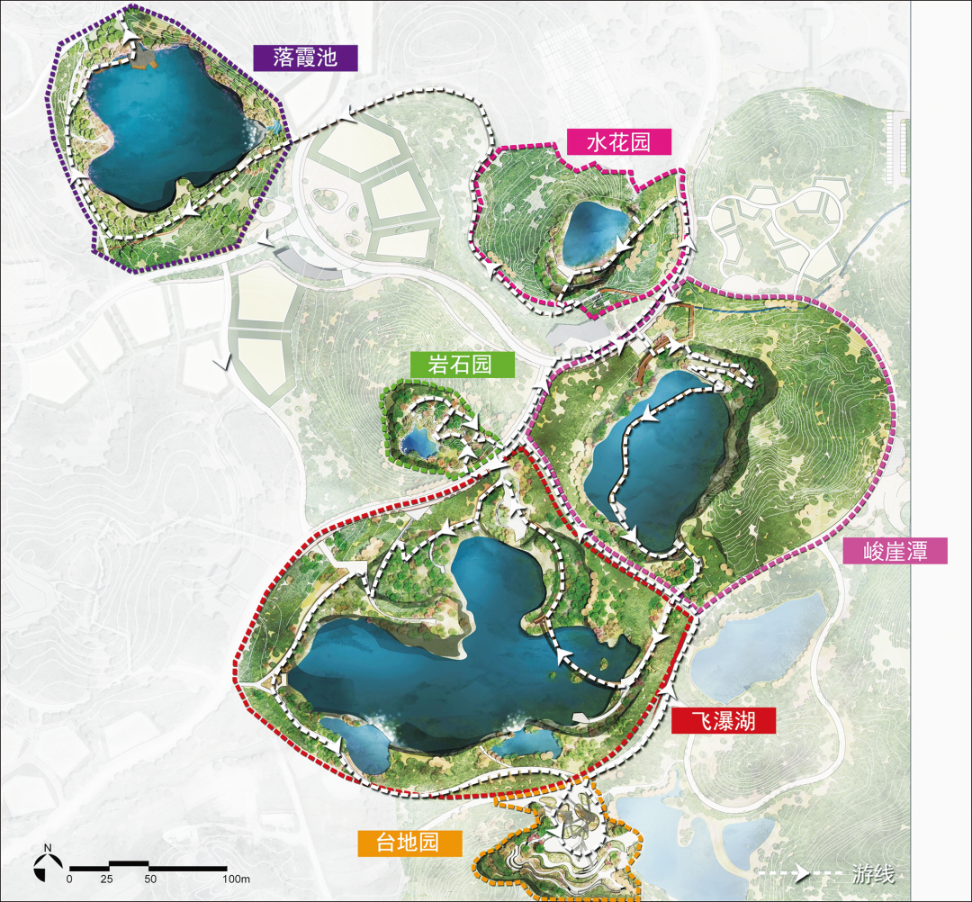 矿坑花园的设计结合本地特色,以6个不同类型的矿坑作为艺术、生态、旅游等多重体验载体,赋予每个矿坑独特的气质。游人进入矿坑花园,会依次体验险峻的峻崖潭,观看亚热带丛林和瀑布景观的飞瀑湖,参观工业记忆和园艺花卉的台地园,游览自然岩石和岩石植物景观的岩石园,感受自然野趣、悬崖景观的水花园,以及观赏山水风韵、三角梅海的落霞池。