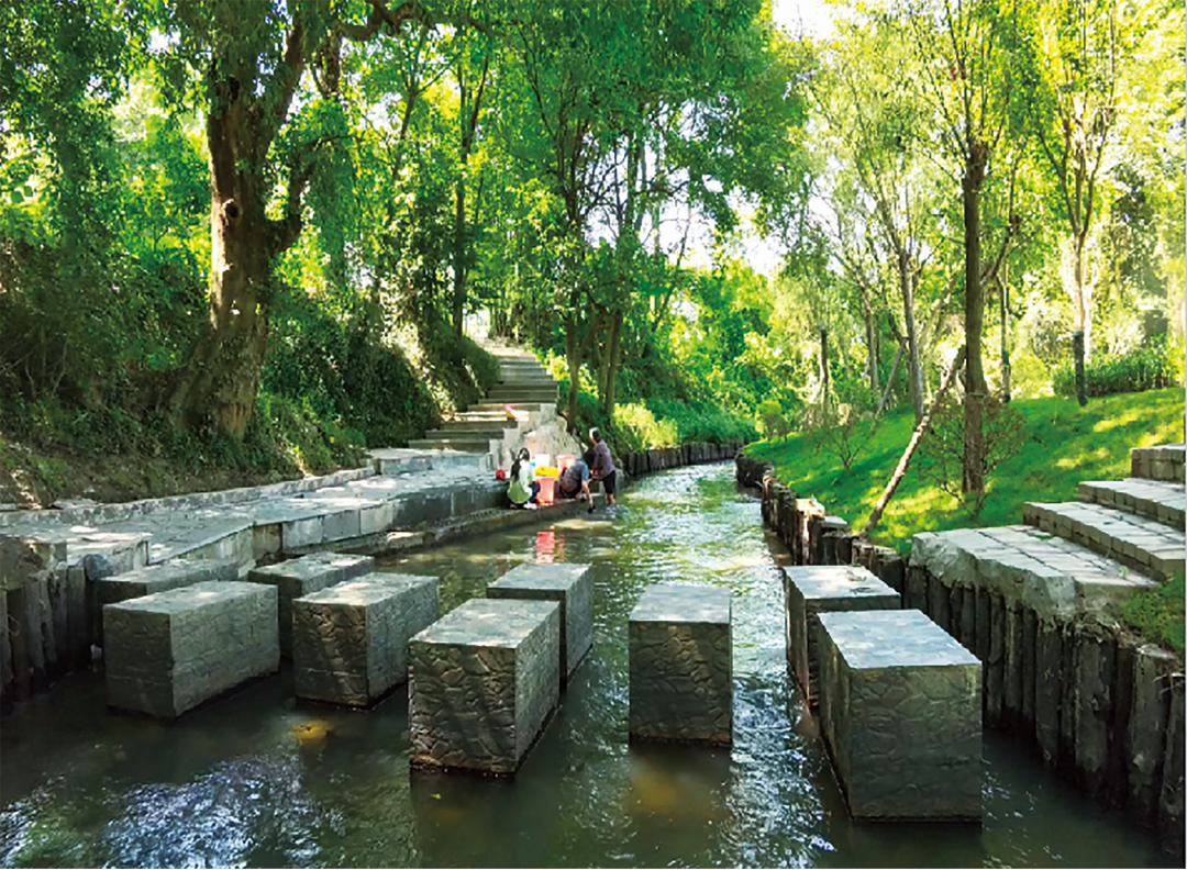 3.以“桃花”为主题,恢复岸边自然植被。针对桃花江岸线植被受损问题,在保留原有植被的基础上,兼顾生态功能、空间结构、季相变化和景观效果,采用近自然的植物群落配植设计,乔灌草结合恢复河岸植被,形成错落有致的近自然植物空间。岸上以桃树为主,搭配垂柳、油桐、枫杨、乌桕、枫香等固土能力强的观花、观叶乡土乔木;灌木层用火棘、肾蕨等本土植物;草本层种植水杨梅、紫云英等须根发达的本土植物;再通过近自然的嵌入式种植设计混播多种草种,搭配常青藤等本土藤蔓。岸下利用狐尾藻等乡野水生植物加以修饰,形成立体多层次、复合多样化的观赏型近自然植物群落。