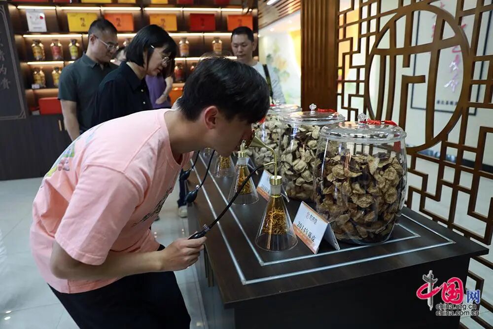 记者在浦北陈皮产业园中体验不同陈化年份的陈皮香味。中国网 赵娜摄影