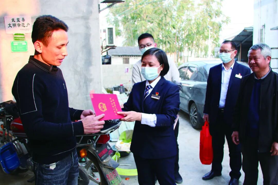 蒙伟雁(左2)深入武宣县三里镇灵湖村为村民颁发农村“房地一体”不动产权证书
