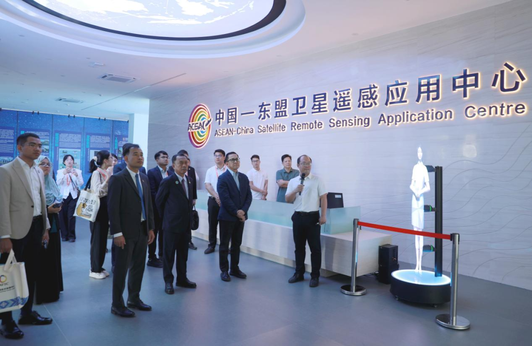 考察团参观了中国—东盟卫星遥感应用中心展示厅,通过参观全息投影数字人“小遥”、观看卫星三维模型演示和宣传片等多种形式,认真了解中国—东盟卫星遥感应用中心的建设背景、机构概况、数据获取和应用服务等情况。考察团还观看了“译快查”智能监测平台、广西实景三维平台、数字孪生可视化平台功能和应用典型案例演示,并围绕面向东盟的遥感数据共享、新技术及应用进行了深入交流。