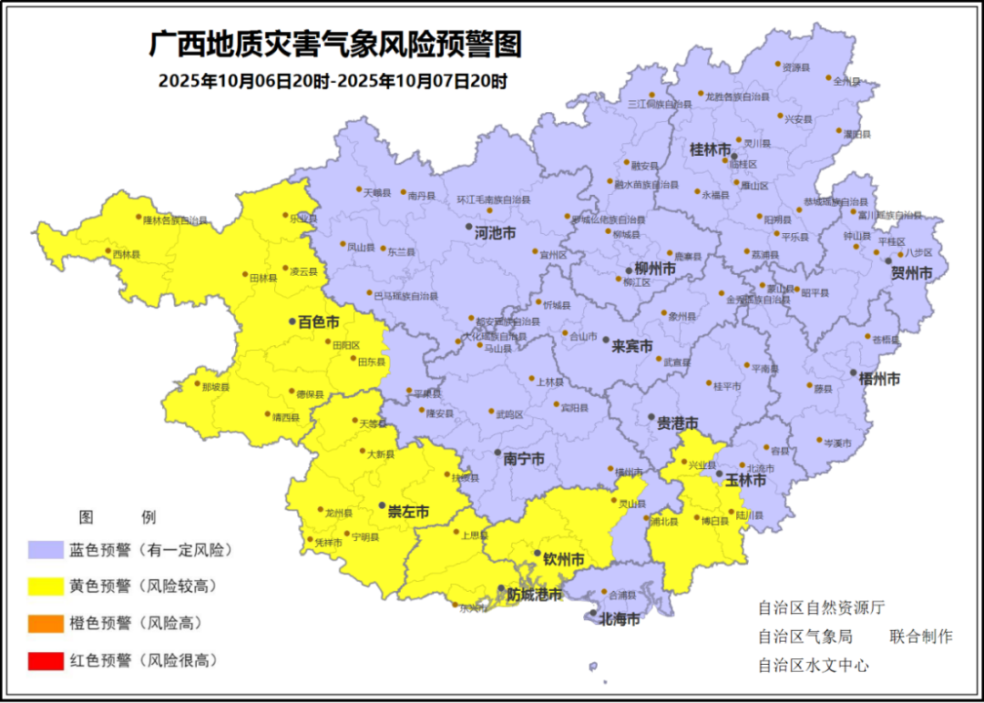 10月6日18时,自治区自然资源厅与自治区气象局、自治区水文中心联合发布地质灾害黄色预警:预报10月6日20时至10月7日20时,防城港市、崇左市,钦州市钦南区、钦北区、灵山县,玉林市福绵区、陆川县、博白县、兴业县,百色市右江区、田阳区、田东县、德保县、那坡县、凌云县、乐业县、田林县、西林县、隆林各族自治县、靖西市发生地质灾害的风险较高(黄色预警)。