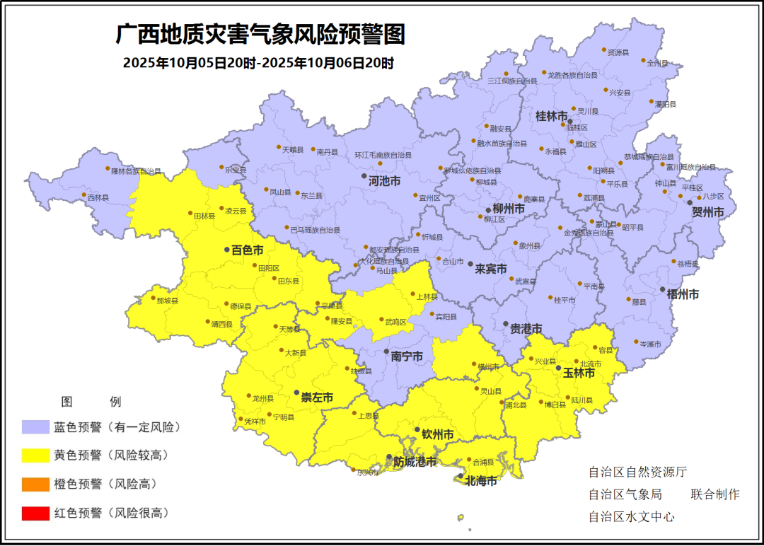 10月5日18时,自治区自然资源厅与自治区气象局、自治区水文中心联合发布地质灾害黄色预警:预报10月5日20时至10月6日20时,北海市、防城港市、钦州市、玉林市、崇左市,南宁市武鸣区、隆安县、上林县、横州市,百色市右江区、田阳区、田东县、德保县、那坡县、凌云县、田林县、靖西市、平果市发生地质灾害的风险较高(黄色预警)。