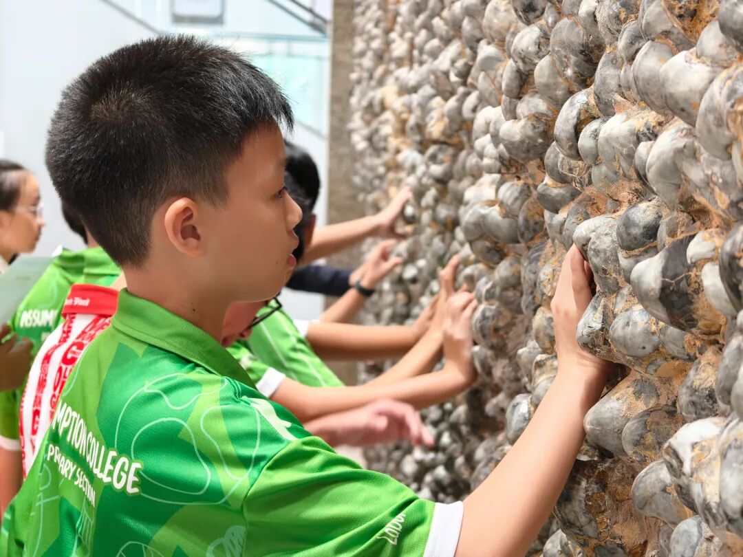 同学们与3.9亿年前的鸮头贝化石近距离接触