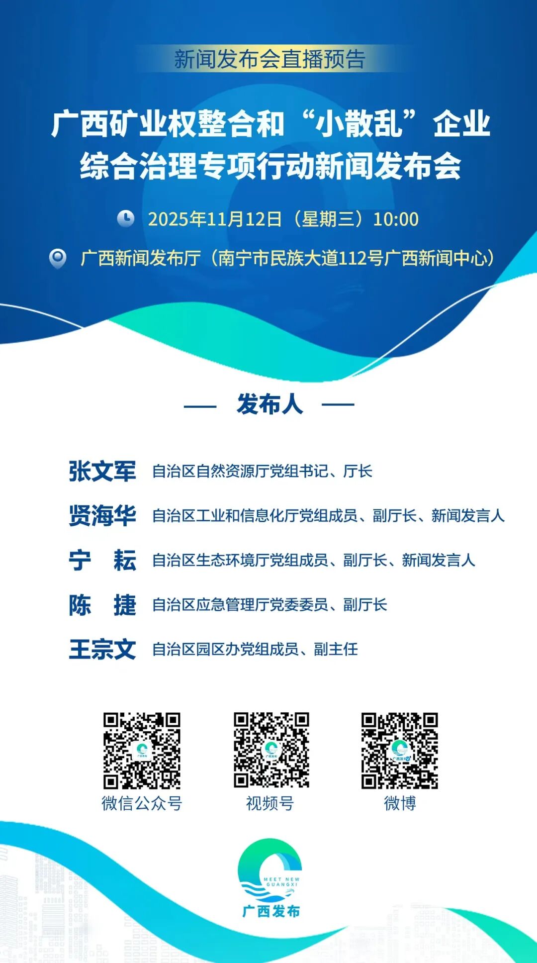 广西壮族自治区人民政府新闻办公室将于2025年11月12日(星期三)10:00,在广西新闻发布厅举行矿业权整合和“小散乱”企业综合治理专项行动新闻发布会,邀请自治区自然资源厅党组书记、厅长张文军;自治区工业和信息化厅党组成员、副厅长、新闻发言人贤海华;自治区生态环境厅党组成员、副厅长、新闻发言人宁耘;自治区应急管理厅党委委员、副厅长陈捷;自治区园区办党组成员、副主任王宗文,介绍广西矿业权整合和“小散乱”企业综合治理专项行动有关情况并回答记者提问。欢迎媒体记者出席。为使记者在发布会上获得更多信息,欢迎通过电子邮件或传真将您对此场发布会感兴趣和关注的问题提供给我们。邮箱:gxxcbfbc@gxi.gov.cn;电话/传真:0771-2093026。地点:广西新闻发布厅(南宁市民族大道112号广西新闻中心)。广西壮族自治区人民政府新闻办公室