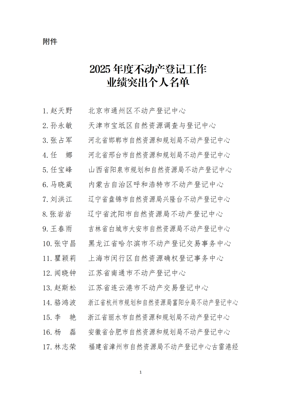 2025年,各地不动产登记机构深入践行以人民为中心的发展思想,贯彻“保护产权、登记为民”工作要求,在持续提升登记服务水平、化解历史遗留问题为群众办证等方面取得显著成效,得到广泛认可。工作中涌现出一批理想信念坚定、服务意识周到、业务能力过硬、团队协作意识强、群众满意度高的业绩突出个人,充分展现了不动产登记队伍良好形象。为进一步激励全国不动产登记工作人员更加奋发有为、担当作为,不断提升不动产登记便民利民服务水平,经研究,部决定对2025年度不动产登记工作业绩突出的赵天野等40名同志予以通报表扬。希望上述同志珍惜荣誉、再接再厉,发挥好示范引领作用,为企业和群众提供更加优质周到的不动产登记服务。各地不动产登记机构要进一步纵深推进队伍作风常态化建设,激励不动产登记工作人员积极向工作业绩突出个人学习,以优良作风提升工作水平,推动不动产登记事业不断取得新发展,维护好各类产权主体合法权益,服务好经济社会发展。自然资源部办公厅