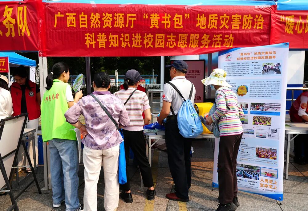 活动现场,党员志愿者服务队重点展示了广西自然资源厅“黄书包”地质灾害防治科普知识进校园志愿服务活动的品牌打造和实施成果,并通过发放宣传手册、现场答疑、互动体验等形式,向市民群众普及地质灾害防治知识。针对群众关心的滑坡、泥石流等灾害前兆识别及避险方法等问题,志愿者们用通俗易懂的语言、耐心细致地进行了解答。